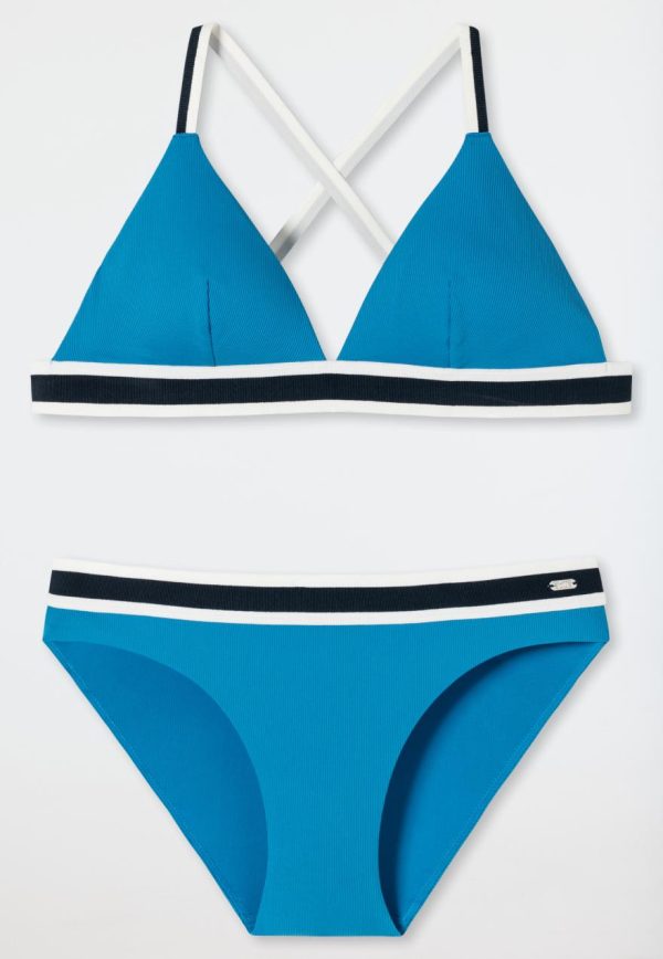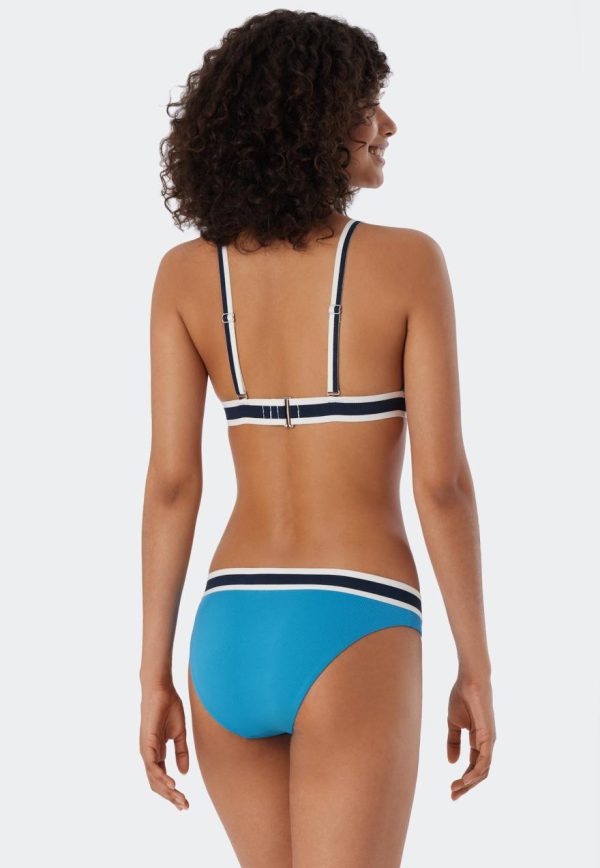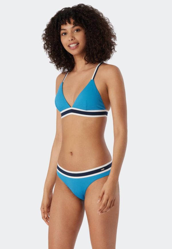 So sportlich und doch so feminin: Dieser gefütterte Triangel-Bikini in Ripp-Optik begeistert mit seinem Retro-Chic! Das Top sieht mit dem gestreiften Unterbrustband und den Trägern einfach gut aus! Die Trageweise ist variabel: Die Softcups lassen sich herausnehmen, die verstellbaren Träger können über Kreuz oder gerade eingestellt werden. Auch der Mini-Slip mit dem dunkelblau-weißen Band ist herrlich lässig. Das nachhaltige Material liegt dabei weich auf der Haut. Beste SCHIESSER-Qualität!