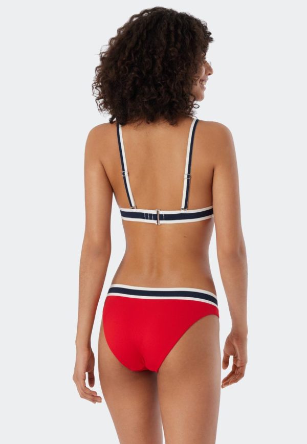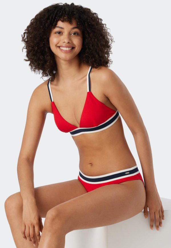 So sportlich und doch so feminin: Dieser gefütterte Triangel-Bikini in Ripp-Optik begeistert mit seinem Retro-Chic! Das Top sieht mit dem gestreiften Unterbrustband und den Trägern einfach gut aus! Die Trageweise ist variabel: Die Softcups lassen sich herausnehmen, die verstellbaren Träger können über Kreuz oder gerade eingestellt werden. Auch der Mini-Slip mit dem dunkelblau-weißen Band ist herrlich lässig. Das nachhaltige Material liegt dabei weich auf der Haut. Beste SCHIESSER-Qualität!