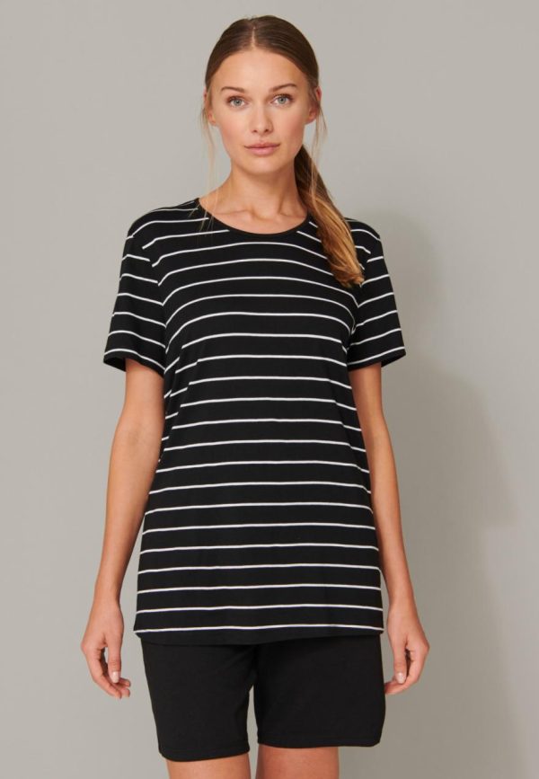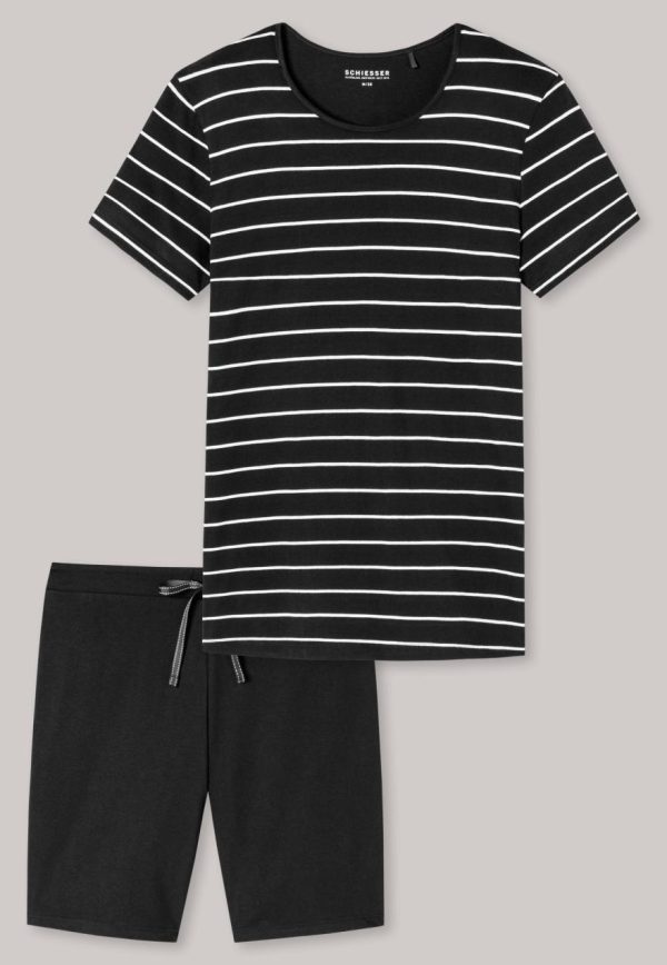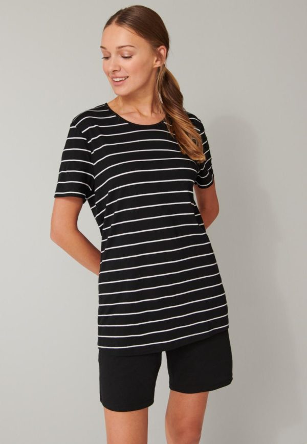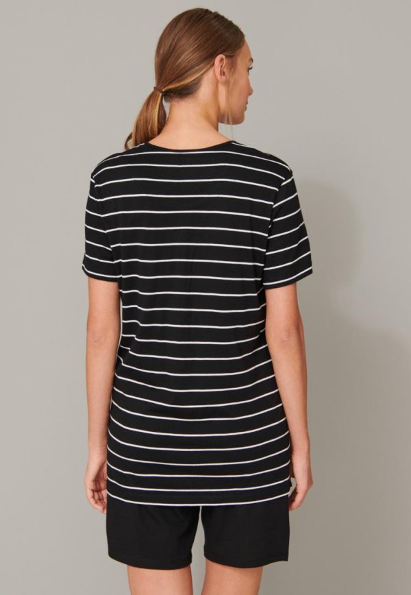 Dieser schwarze, kurze Damen-Schlafanzug ist genau das Richtige für entspannte Nächte! Weicher Single Jersey aus Baumwolle und Modal sorgt dabei für hohen Tragekomfort und bekommt mit dem weiß geringelten T-Shirt einen modischen Marine-Look. Ein uni-abgesetzter Rundhals-Rand sowie der abgerundete Saum setzen charmante Details und werden von der uni-farbenen Bermuda-Shiorts mit weiß besticktem Bindeband stimmig begleitet. Ein bequemes Nachtwäsche-Duo in bester SCHIESSER-Qualität!