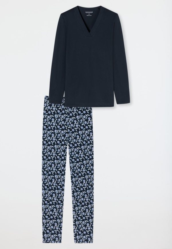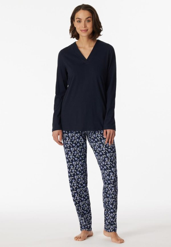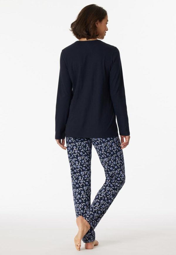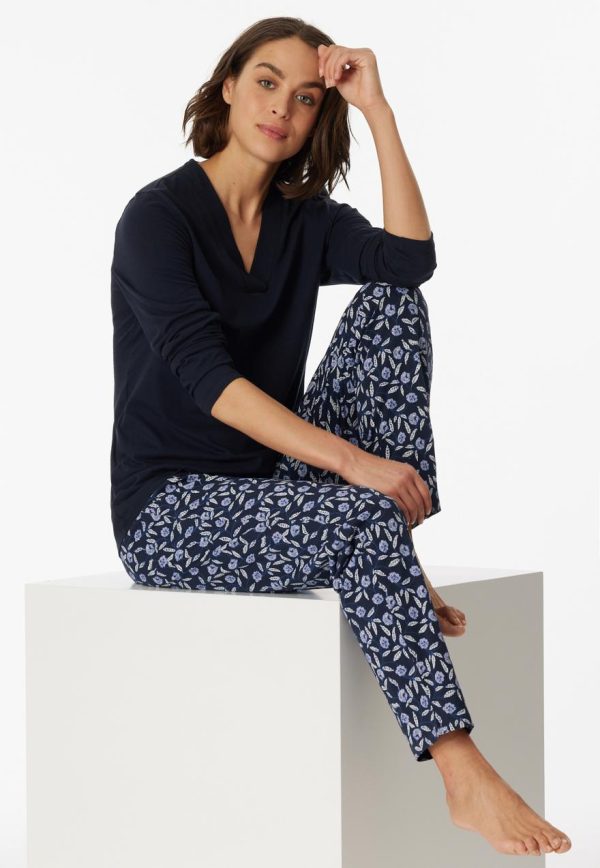 - nachtblauer, langer Damen-Schlafanzug mit Hose mit Blumenprint