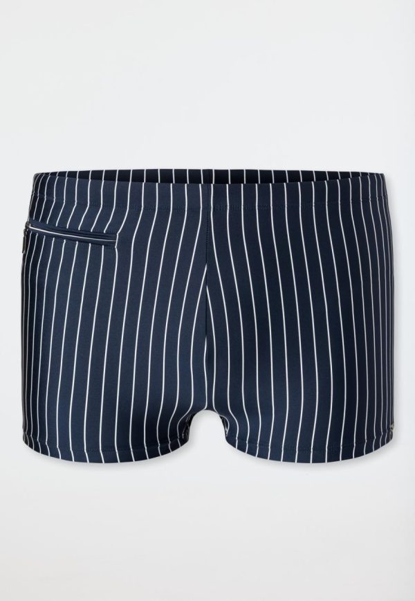 Auf ganzer Linie überzeugen diese Bade-Retroshorts alle stilsicheren Herren. Die Badehose sieht mit seinem weißen Streifen-Muster nicht nur besonders modisch aus, sondern begeistert zusätzlich mit praktischen Details: Eine kleine Tasche mit Reißverschluss schenkt den Shorts ein cleveres Extra, in dem Kleingeld oder ein Schlüssel sicher verstaut werden können. In recycelter, formbeständiger Wirkware steht so einem entspannten Tag in bester SCHIESSER-Qualität nichts mehr im Wege.
