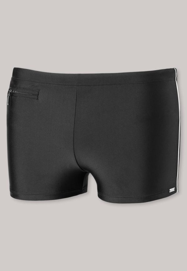 - schwarze, körpernahe Herren-Badeshorts mit weißen, seitlichen Streifen