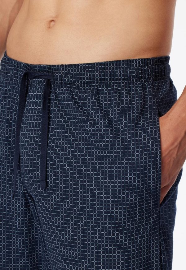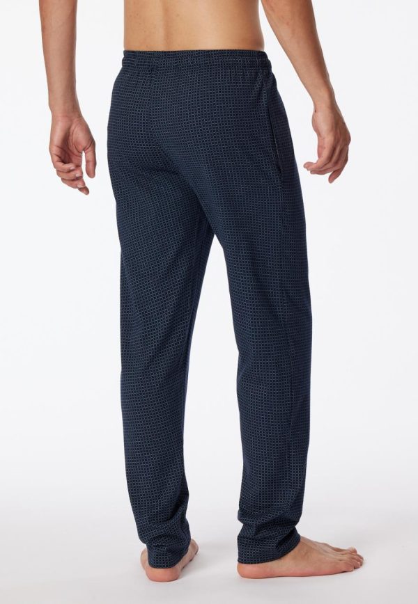 Diese dunkelblau-gemusterte Herrenhose ist genau das Richtige für entspannte Tage und Nächte! Die lockere Jogginghose überzeugt durch ihr weiches Jersey-Material aus 100 % Baumwolle und ist mit seitlichen Taschen sowie einer funktionalen Knopfleiste ausgestattet. Das dunkelblaue Bindeband am elastischen Bund setzt ein weiteres, praktisches Details. Ein bequemes Basic in bester SCHIESSER-Qualität!