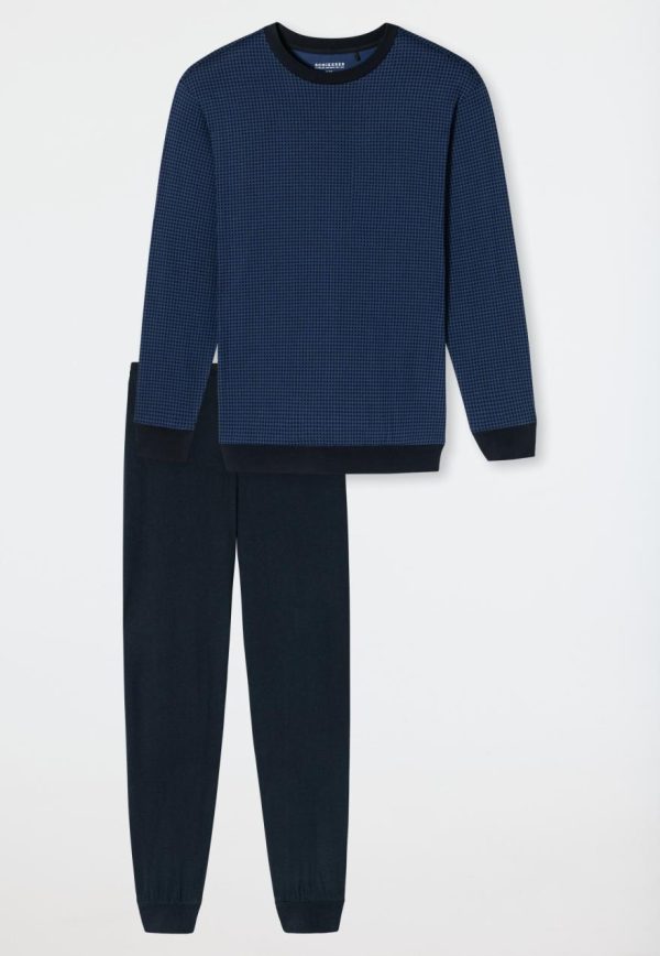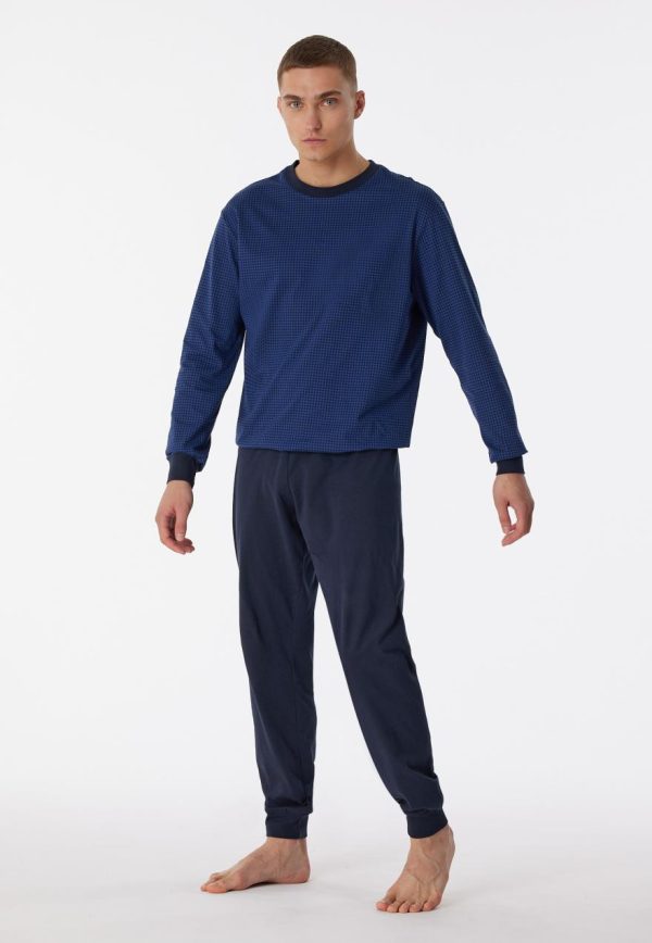 - langer Herren-Schlafanzug mit gemustertem Langarmshirt in Blautönen und navyfarbener Hose