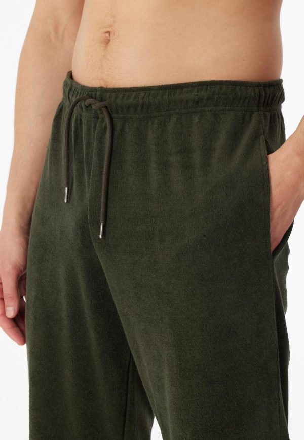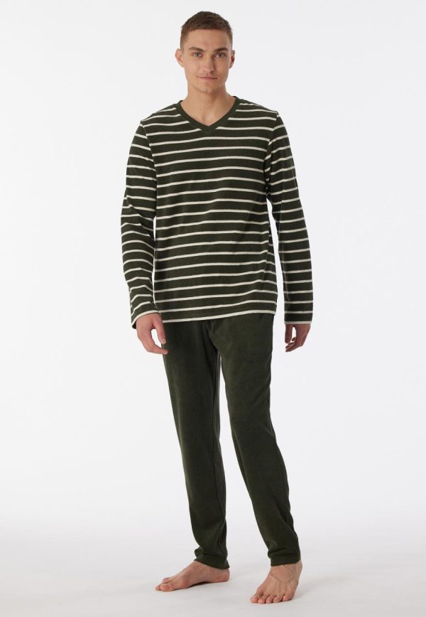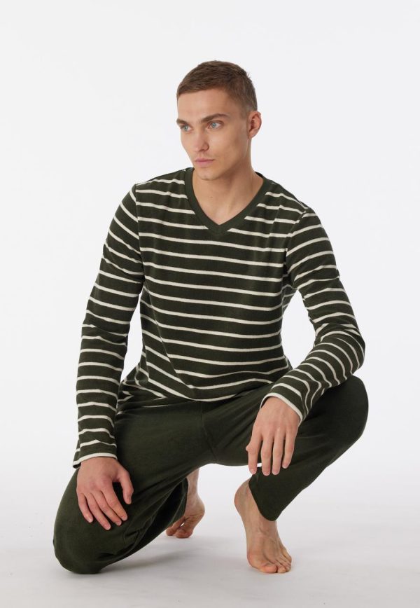 Herren Schlafanzüge | SCHIESSER Schlafanzug Lang Frottee V-Ausschnitt Streifen Dunkelgrün Warming Nightwear Dunkelgrün