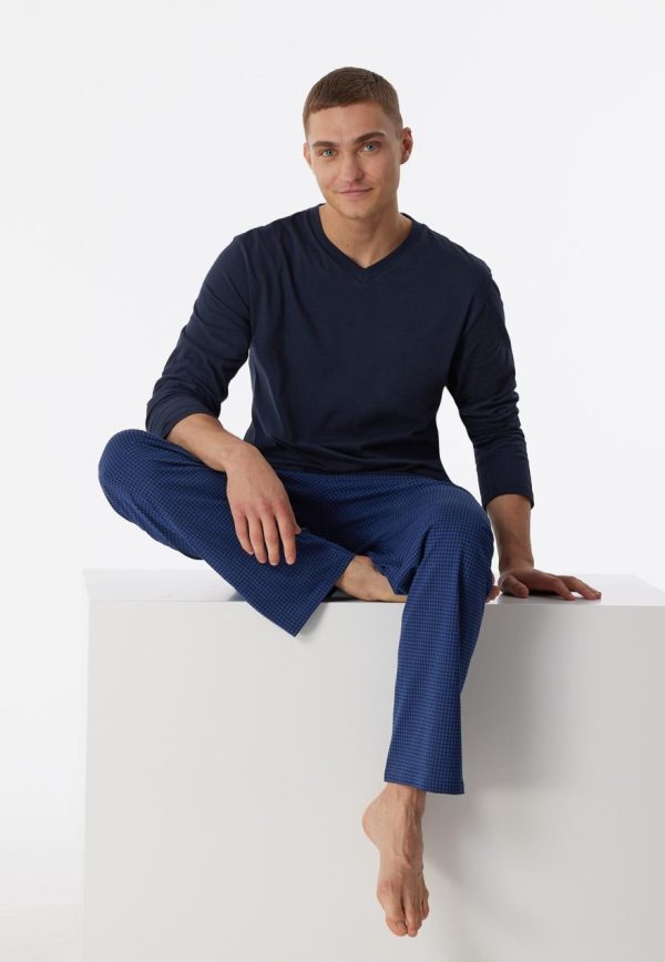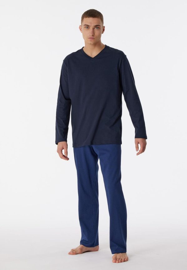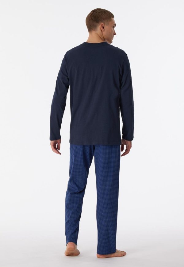 - langer Herren-Schlafanzug mit nachtblauem Langarmshirt und gemusterter Hose in Blautönen