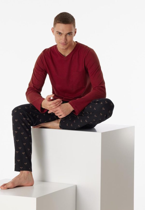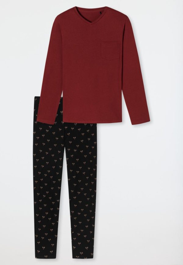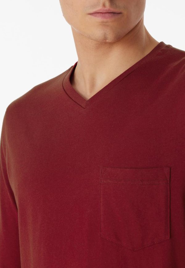 - bordeaux-rotes Oberteil mit V-Ausschnitt und Brusttasche