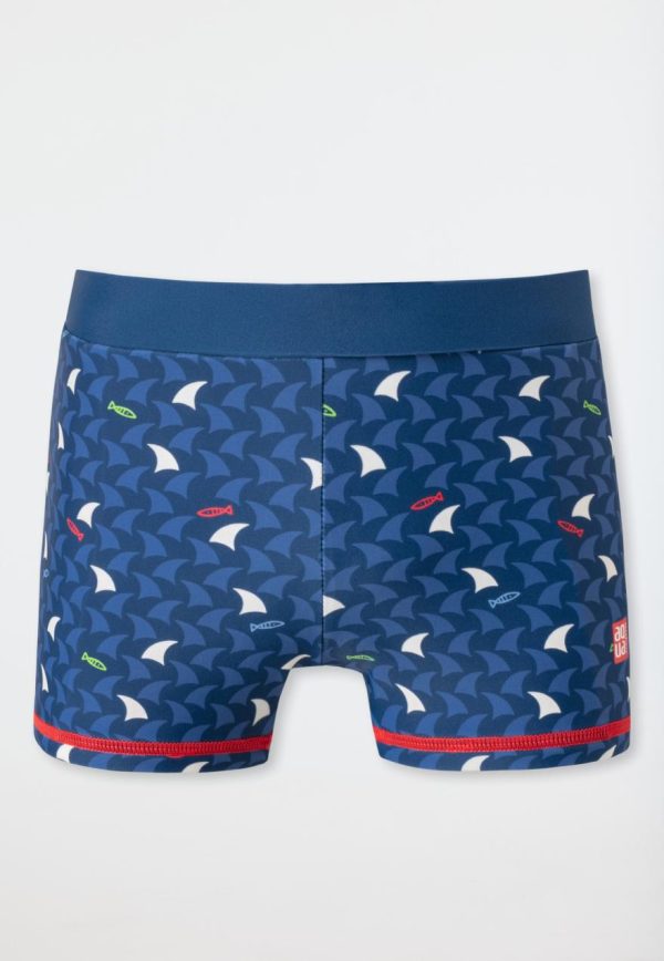 - Bade-Retroshorts für Jungen in Dunkelblau mit Allover-Muster aus Haiflossen und Fischen
