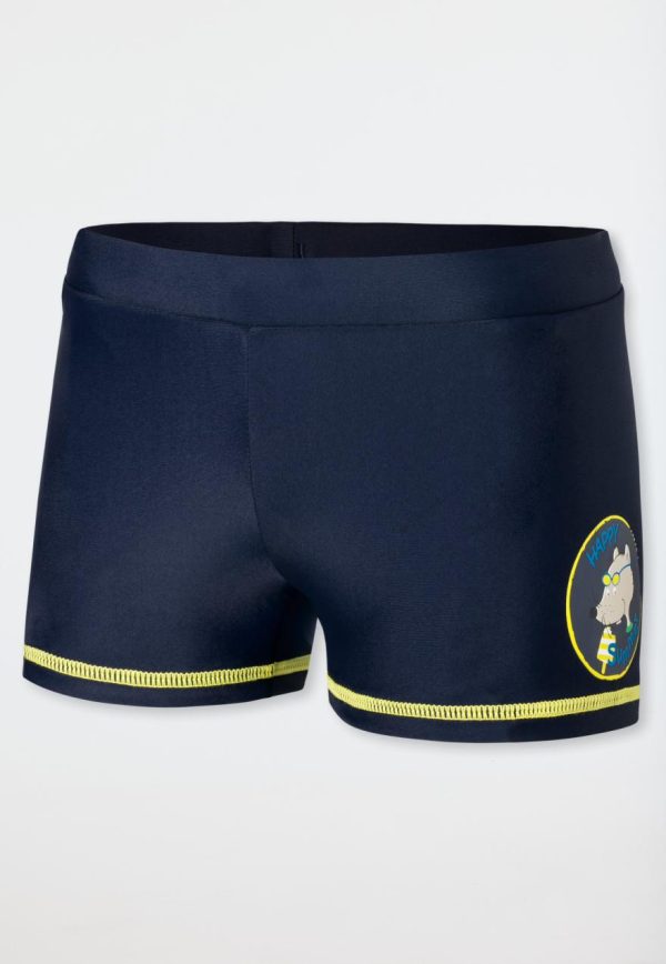 - unifarbene Bade-Retroshorts für Jungen in Dunkelblau mit Rat Henry-Motiv am Bein