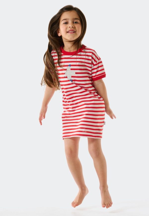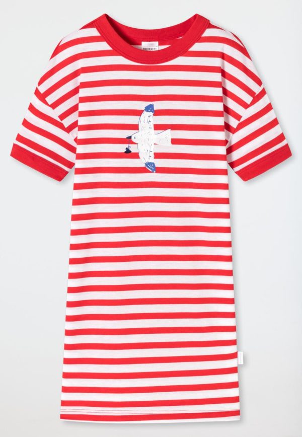 Dieses rot-weiße Kurzarm-Nachthemd für Mädchen verspricht jede Menge süße Träume! Mit seinem fröhlichen Ringel-Muster zaubert die Nachtwäsche jedem ein Lächeln beim Zubettgehen ins Gesicht. Ein echter Hingucker ist eine prächtige Möwe auf der Brust, die mit kleinem „Herz-Geschenk“ im Schnabel den Sommer einläutet. In herrlich bequemer und hautfreundlicher Baumwoll-Bamboo-Qualität können die Kleinen auch in wärmeren Nächten entspannt zur Ruhe kommen. Beste SCHIESSER-Qualität inklusive!
