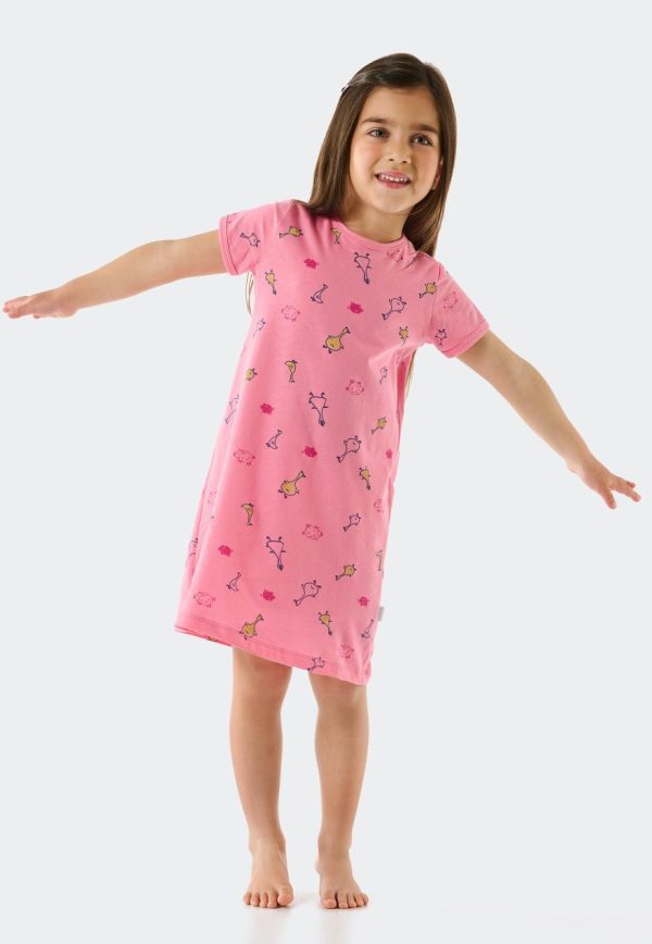 Dieses pinkfarbene Kurzarm-Nachthemd für Mädchen verspricht jede Menge tierische Träume! Mit seinem niedlichen und frischen Allover-Muster aus Gänsen und kleinen Schweinchen zaubert die Nachtwäsche jedem ein Lächeln beim Zubettgehen ins Gesicht. In 100% hautfreundlicher Bio-Baumwolle lässt es sich herrlich entspannen und auch in wärmeren Nächten bestens zur Ruhe kommen. Ein hübsches Sleepshirt mit ganz viel Natürlichkeit in bester SCHIESSER-Qualität.
