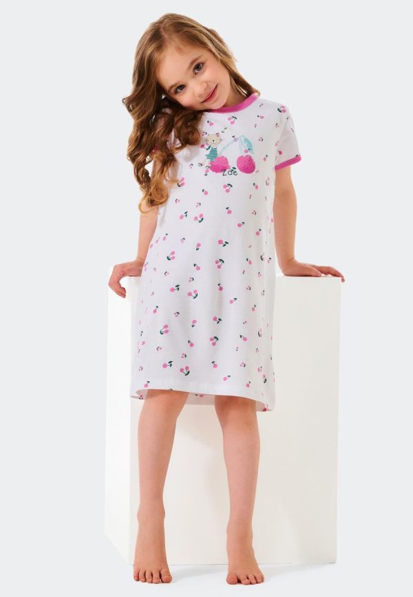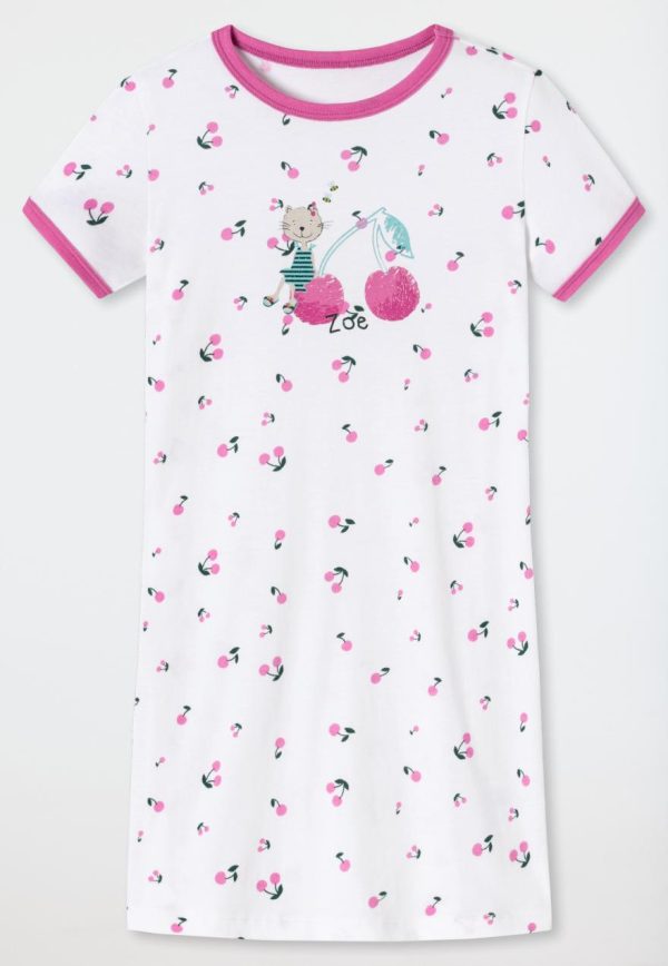 Dieses weiße Kurzarm-Nachthemd für Mädchen verspricht jede Menge süße Träume! Mit seinem farbenfrohen und frischen Allover-Muster aus pinkfarbenen Kirschen zaubert die Nachtwäsche jedem ein Lächeln beim Zubettgehen ins Gesicht. Ein echter Hingucker ist unsere Cat Zoe, die entspannt auf einer großen Kirsche den Sommer einläutet. In 100% hautfreundlichem Organic Cotton können die Kleinen auch in wärmeren Nächten entspannt zur Ruhe kommen. Beste SCHIESSER-Qualität inklusive!