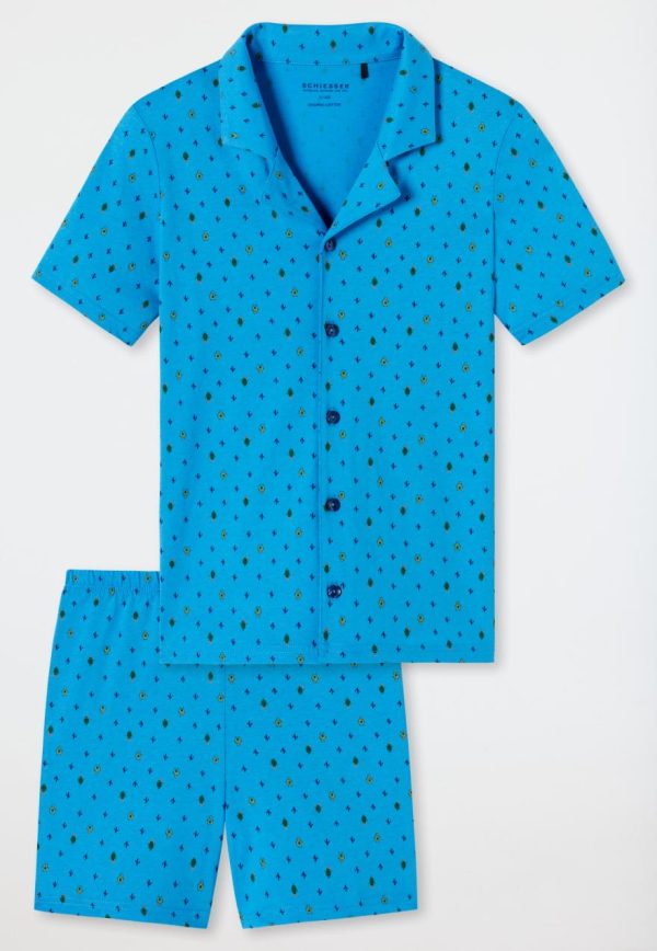 Modische Boys werden vom trendy Look dieses kurzen, aquablauen Jungen-Pyjamas absolut begeistert sein! Auf dem T-Shirt mit Hemdkragen und Knopfleiste sowie auf den Shorts mit bequemem Bund setzt das farbenfrohe Kaktus-Muster ein cooles Highlight. In softem Single Jersey aus 100 % Organic Cotton verspricht der Zweiteiler spannende Träume in bester SCHIESSER-Qualität!