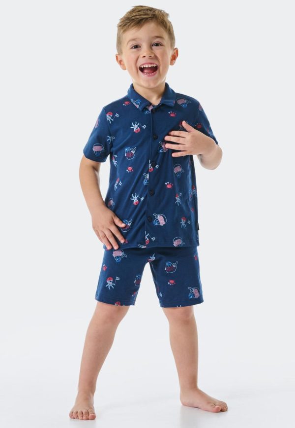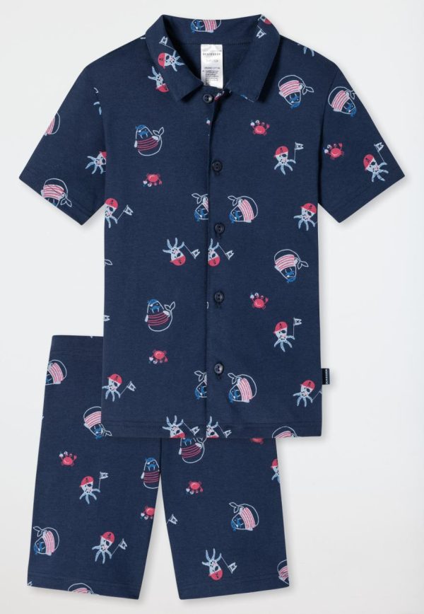 Dieser kurze, dunkelblaue Jungen-Pyjama garantiert entspannte Träume. Mit dem fröhlichem Allover-Muster aus wilden Tier-Piraten sieht der Zweiteiler nicht nur besonders fröhlich aus, sondern überzeugt zusätzlich mit pfiffigen Details: Die durchgehende Knopfleiste ist beim Anziehen besonders praktisch und dank softem Bund sitzen die Schlafshorts auch in der Nacht perfekt. Eine abenteuerlustige Nachtwäsche aus 100% hautfreundlicher Bio-Baumwolle und bester SCHIESSER-Qualität!