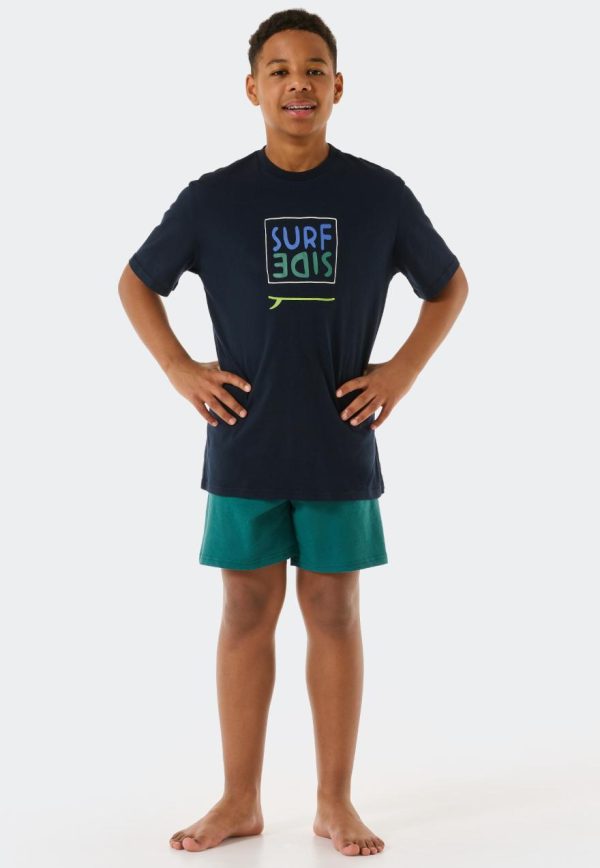 - kurzer Jungenschlafanzug mit dunkelblauem T-Shirt mit „SURF SIDE“-Schriftzug und dunkelgrünen Shorts