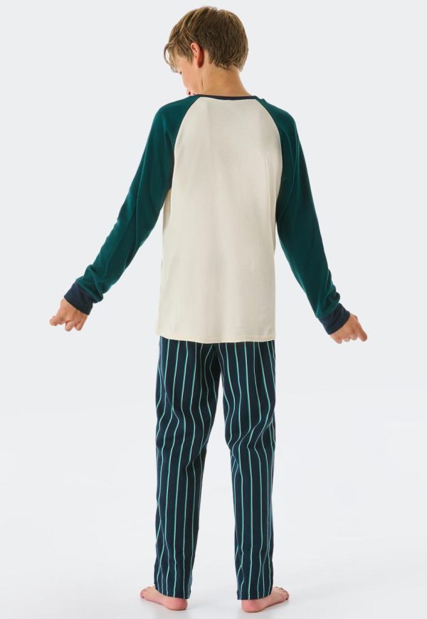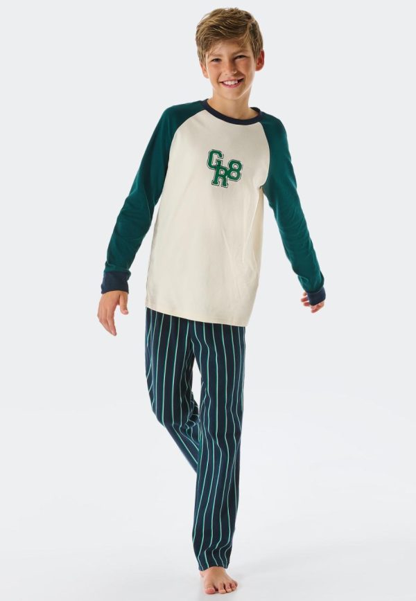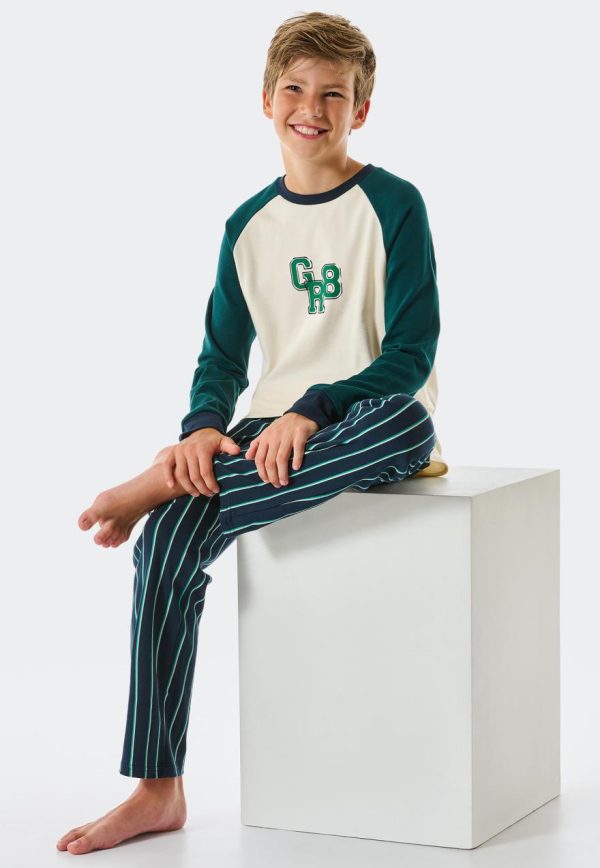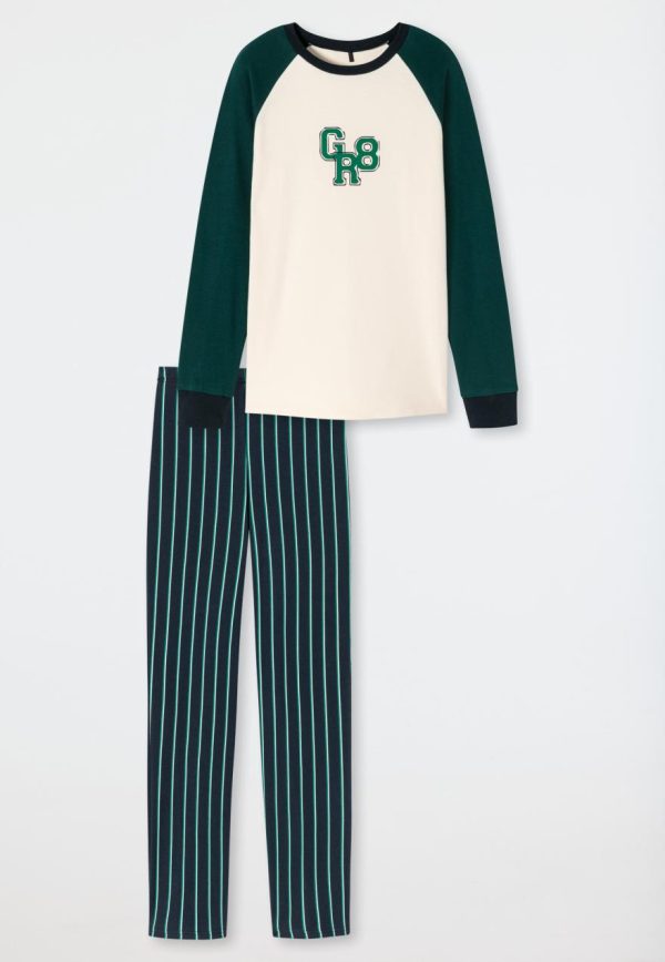 - langer, weißer Jungenschlafanzug mit „GR8“-Schriftzug und gestreifter Hose