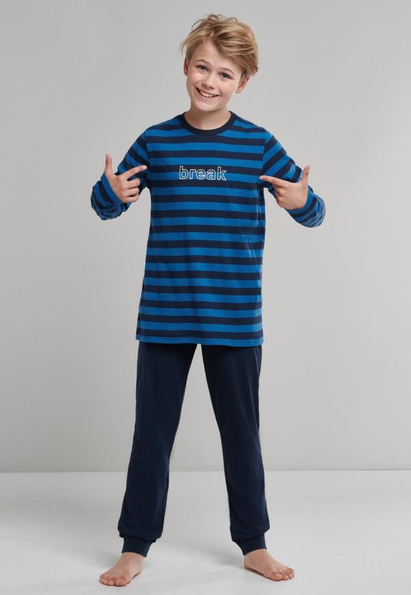 - langer Schlafanzug für Jungen mit blauen Ringeln, blauer Hose und „Break“-Schriftzug auf der Brust