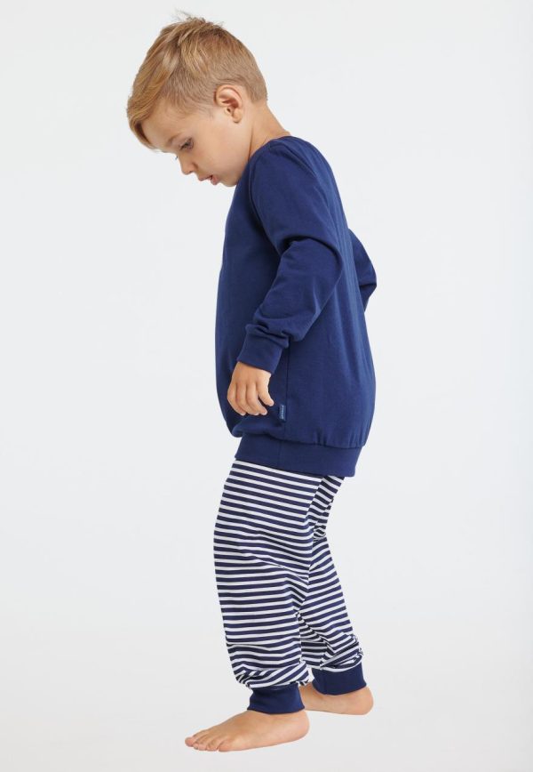 Dieser lange Jungen-Schlafanzug ist genau das Richtige für starke Traumabenteuer! Das Oberteil in coolem Dunkelblau ist nicht nur ein farbenfroher Hingucker, sondern sorgt mit seinem großen Baustellenfahrzeug für strahlende Augen vor dem Zubettgehen. Gemeinsam mit der blau-weiß geringelten Hose und praktischen Bündchen sitzt der Zweiteiler herrlich bequem. Für kleine Baumeister aus 100% hautfreundlichem Organic Cotton und natürlich bester SCHIESSER-Qualität!