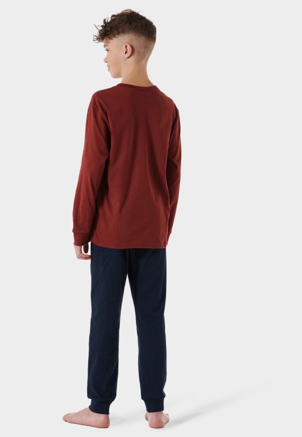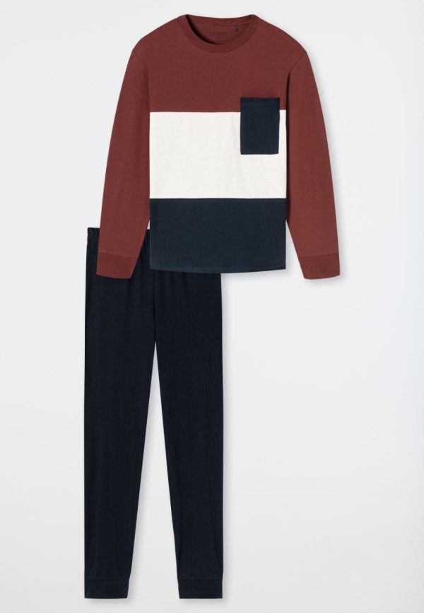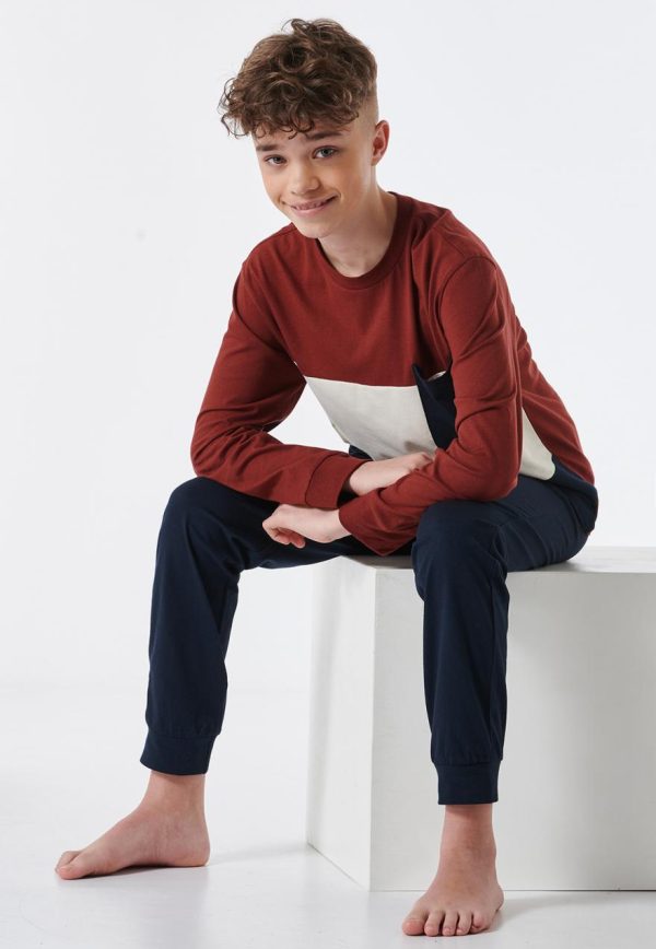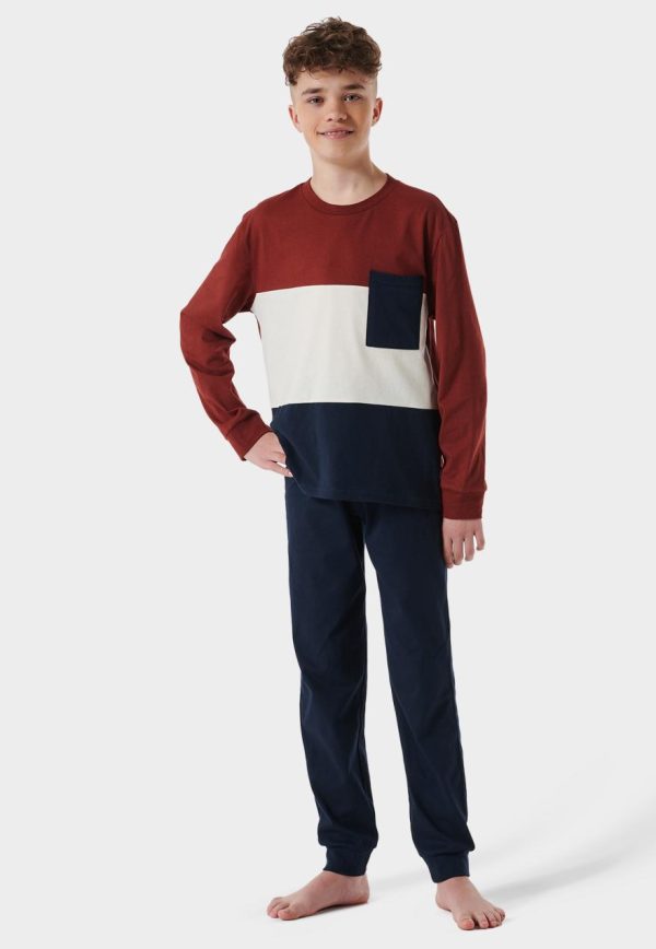 - langer Jungenschlafanzug mit geringeltem Langarmshirt in Braun, Off-white und Nachtblau