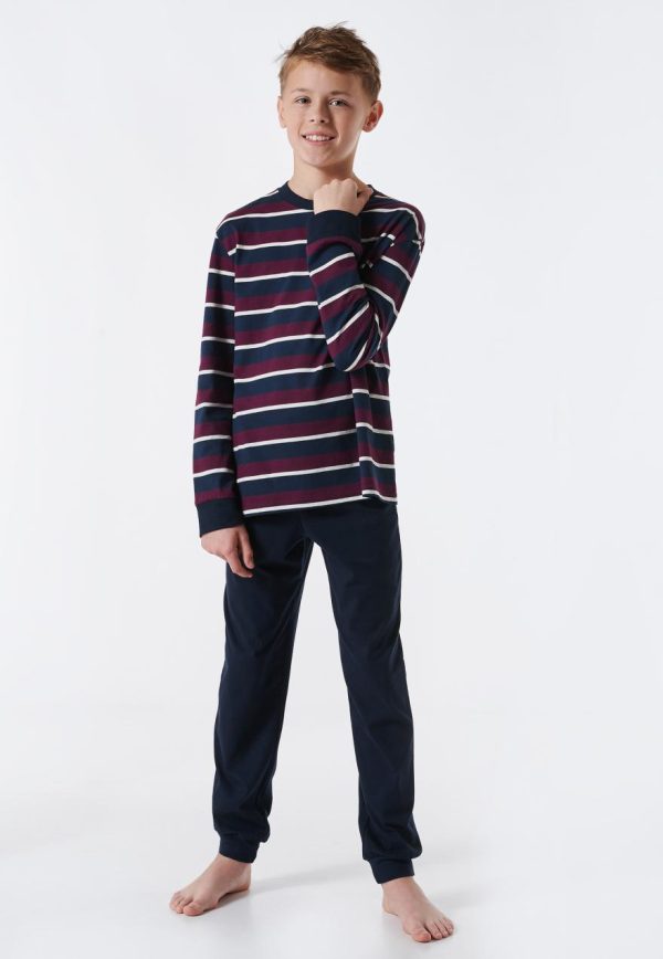 - langer Jungenschlafanzug mit gestreiftem Langarmshirt in Aubergine, Off-white und Nachtblau