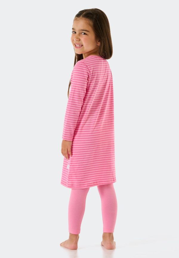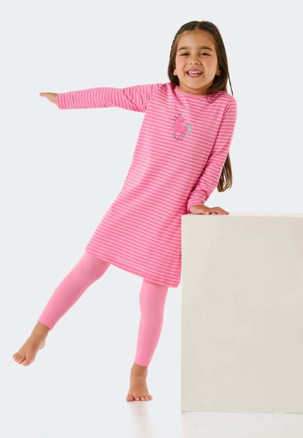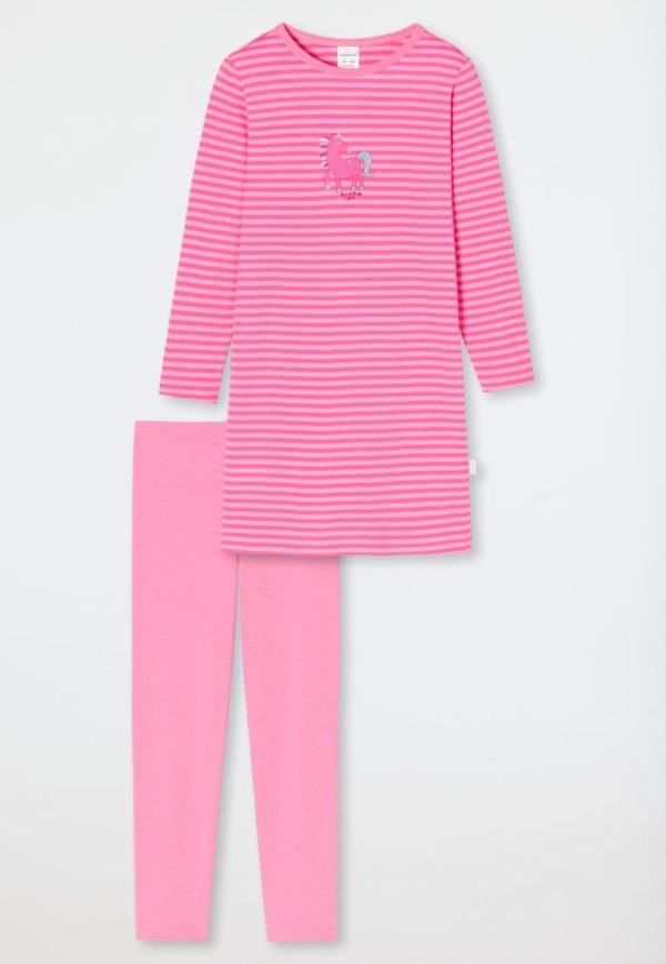Dieser lange Mädchenschlafanzug macht das Zubettgehen zum reinsten Kinderspiel! Das gestreifte Nachthemd begeistert kleine Pferde-Freundinnen mit einem hübschen Pony auf der Brust. Die unifarbene Leggings passt prima dazu. Für jede Menge Wohlgefühl sorgt das softe Jersey-Material aus 100% nachhaltiger Baumwolle. Einfach ins Bett kuscheln und schöne Träume in bester SCHIESSER-Qualität genießen!