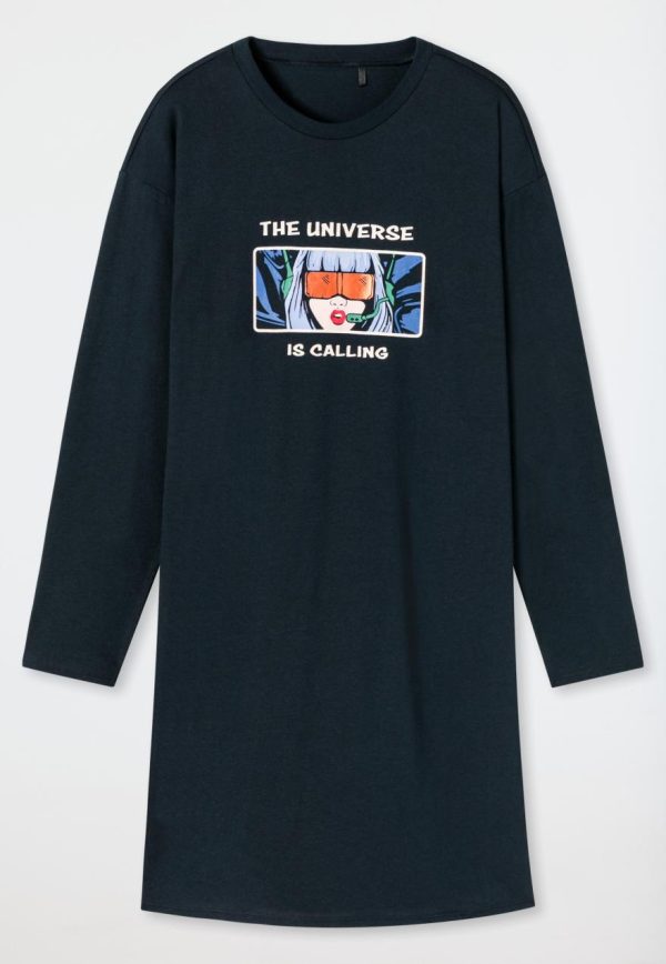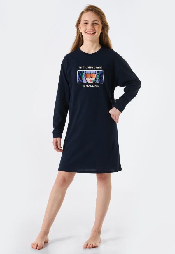 - langärmeliges, nachtblaues Mädchen-Sleepshirt mit „THE UNIVERSE IS CALLING“-Schriftzug