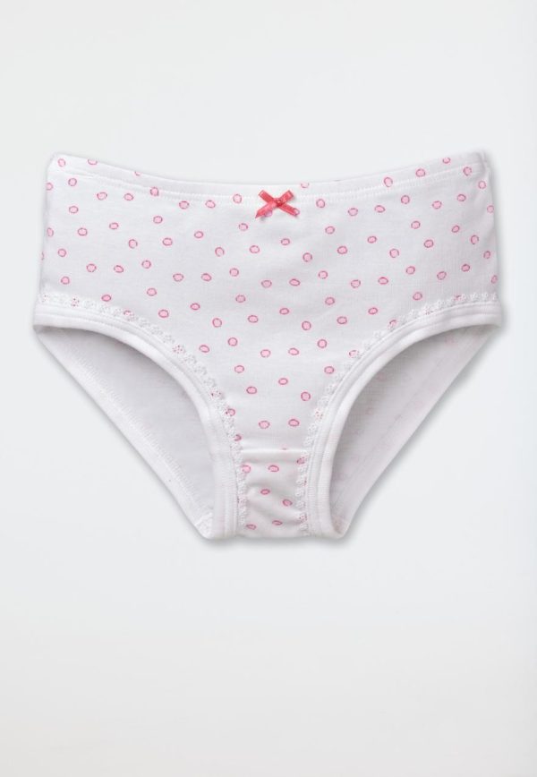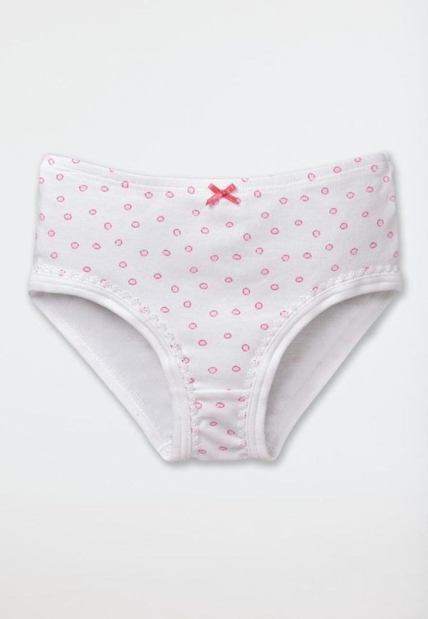 Tupfen zum Verlieben: Dieser weiße Mädchenslip wickelt fröhliche Girls mit seinem zauberhaften Look und softem Material um den Finger! Rosafarbene Tupfen, ein feines Schleifchen und die zarte Verzierung am Beinabschluss schenken dem Hüftslip nicht nur einen mädchenhaften Charme, sondern fühlen sich in hochwertiger, elastischer Feinripp-Qualität dabei auch noch herrlich weich und anschmiegsam an! Ideal für Mädels, die traumhaft-süße Wäsche in bester SCHIESSER-Qualität mögen!