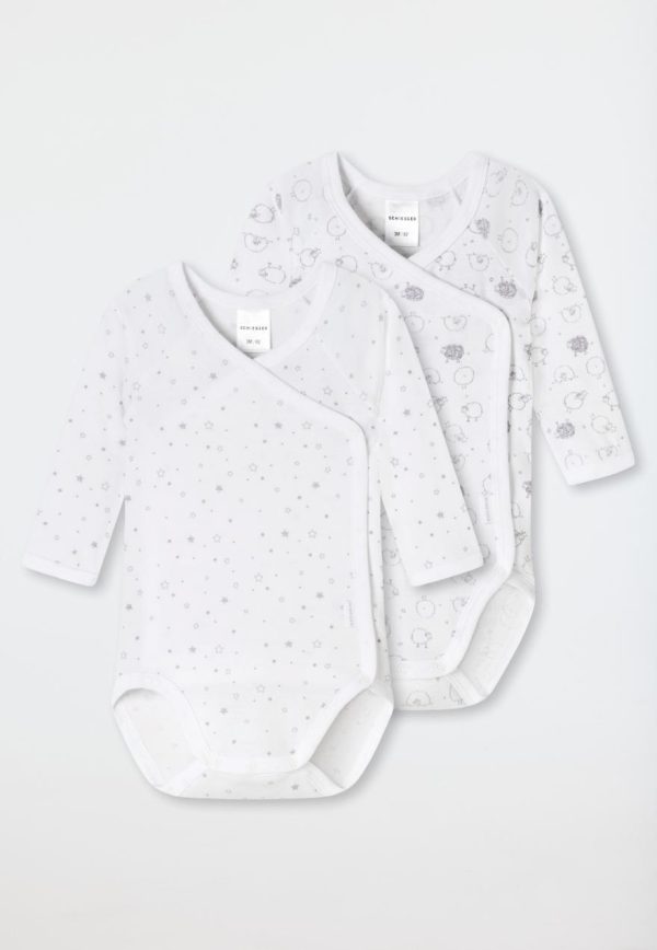 - weiße, bedruckte Langarm-Wickelbodys Unisex im praktischen Doppelpack